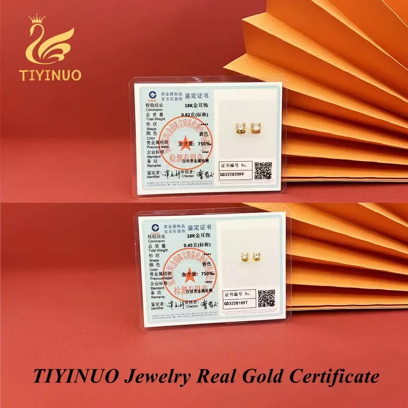 TIYINUO 쥬얼리는 실제 18k 골드와 실제 골드 인증서를 제공하며 실제가 아닌 18k 골드에 대한 전액 환불을 제공합니다. 품질이 보장되며, 18k 금은 퇴색하지 않으며 알레르기가 없습니다.
