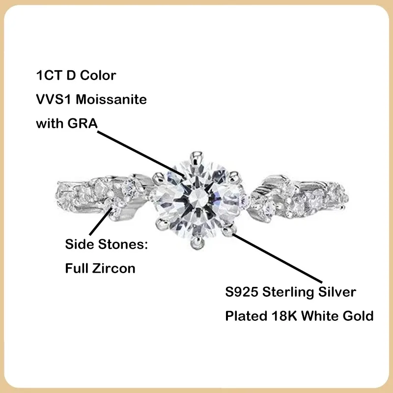 페오버GRA 인증 1CT 진짜 모이사나이트 반지 여성용 D 컬러 VVS1 랩 다이아몬드 S925 은색 약혼 약속 웨딩 밴드 쥬얼리 재질: 100% 925 스털링 실버 + 리얼 모이사나이트 + 5A 지르콘 메인 스톤: 6.5mm/1ct모이사나이트 사이드 스톤: 5A 지르콘 모이사나이트 색상: D 색상 모이사나이트 선명도: VVS1 모이사나이트 컷: 우수 무료 GRA 인증 포함: 예 패키지: 1 개 반지 + 보석 상자 + GRA 인증