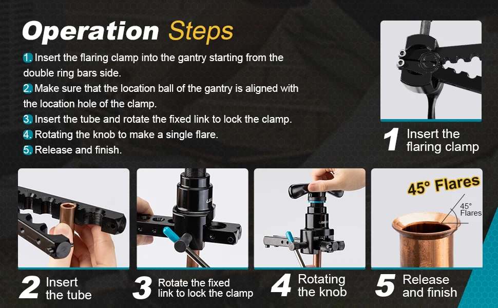 ③ [광범위한 적용]튜브 플레어 툴은 구리 튜브, 황동 튜브 및 알루미늄 튜브와 같은 연질 금속 튜브에 적용할 수 있습니다. HVAC, 에어컨, 에어 히터, 냉장고 등에 널리 사용됩니다.