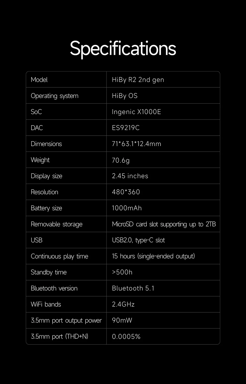 HiBy는 효율적인 CPU와 OS로 완전히 새로운 R2 II를 설계했습니다. 플레이어에는 최대 15 시간 연속 음악 재생과 최대 20 일 대기 시간을 제공하는 1000mAh 대형 배터리가 장착되어 있습니다.