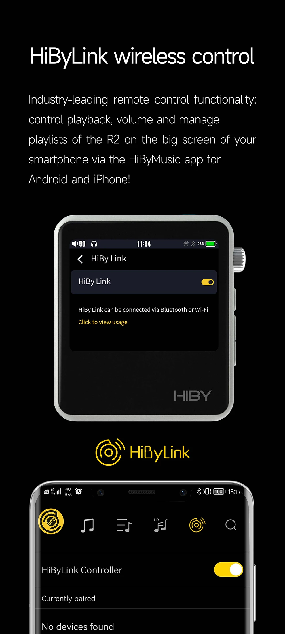 스마트 폰을 통해 무선 HiByLink 원격 기능을 사용하여 R2 II에서 재생을 제어 할 수 있습니다. 재생 및 볼륨을 제어 할 수있을뿐만 아니라 장치에서 다른 재생 목록을 관리 할 수 있습니다. HiByLink는 Android 및 Apple 스마트 폰에서 HiBy Music 응용 프로그램을 통해 사용할 수 있습니다.