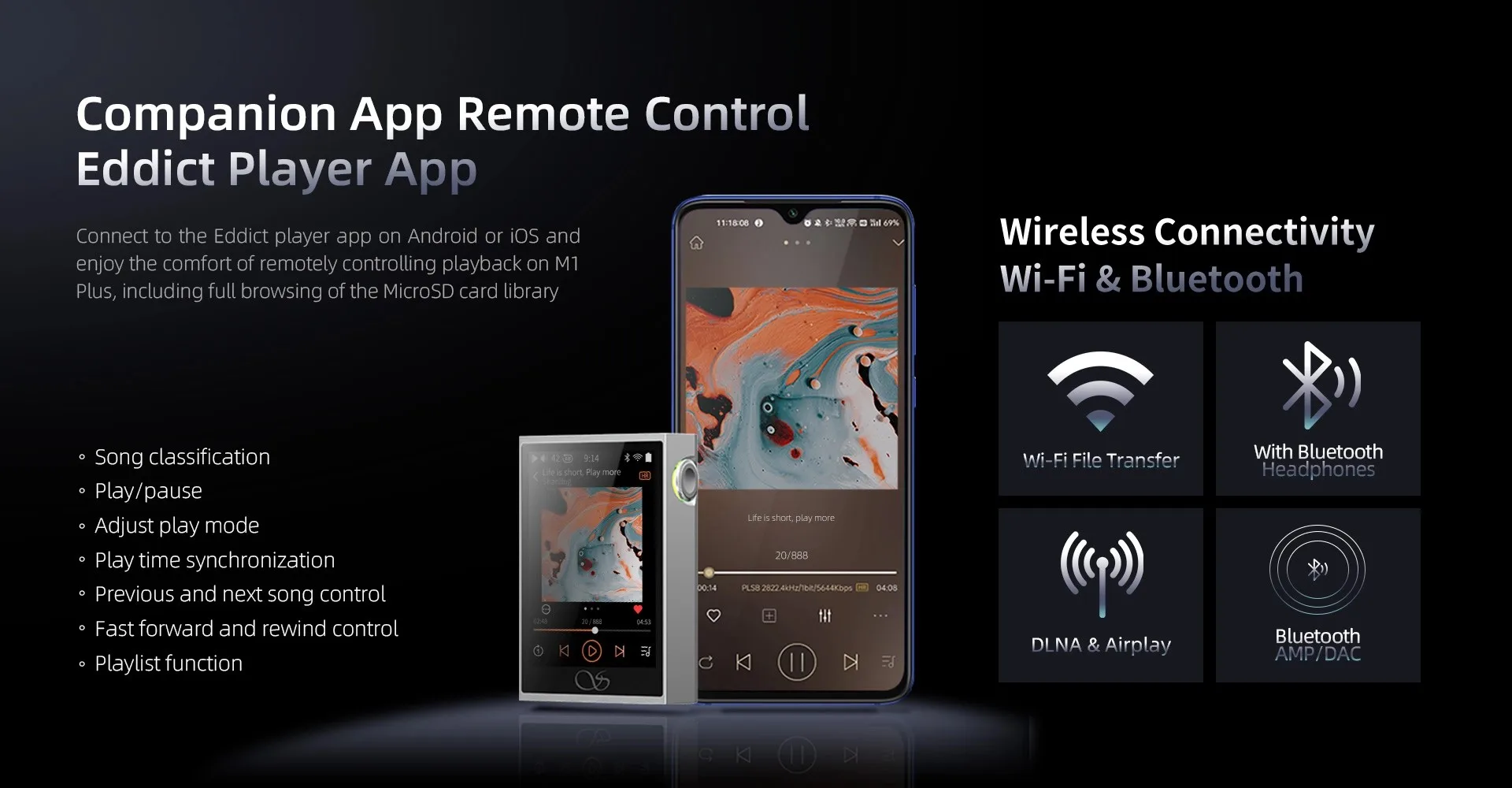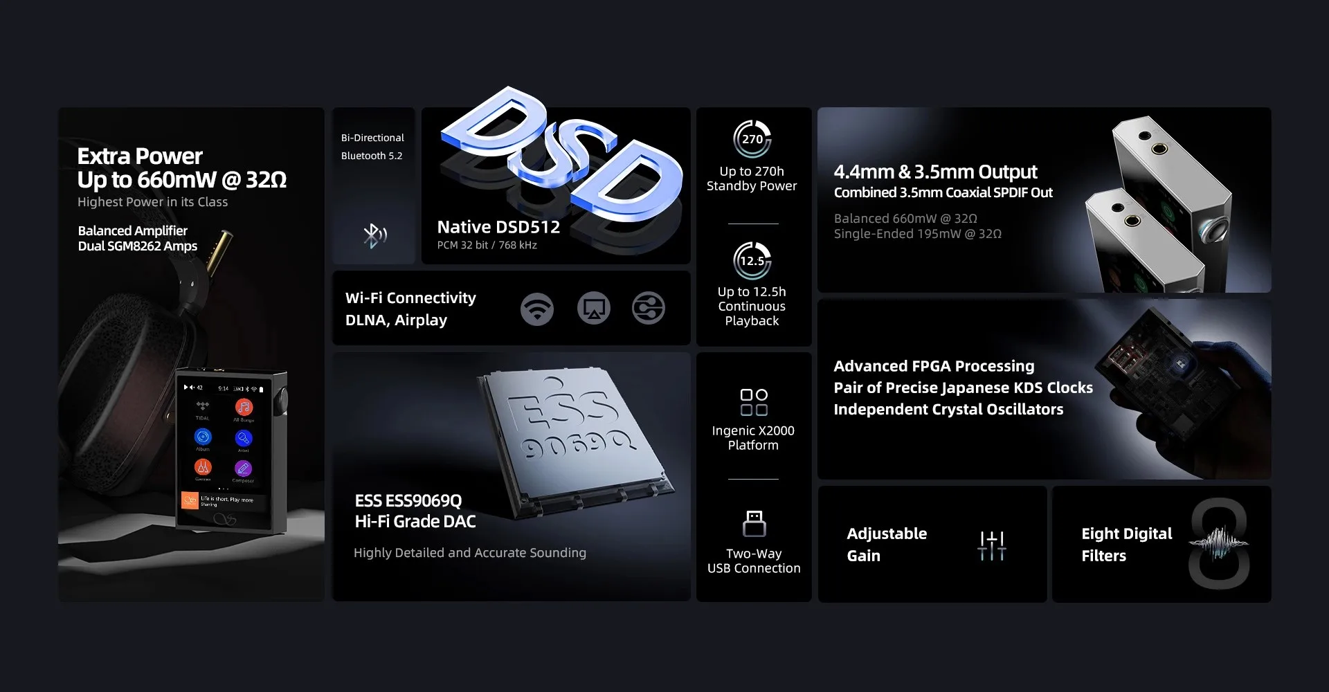 Ingenic X2000 프로세서의 최신 MTouch 시스템을 활용하여 M1 Plus는 풍부한 표준 기능 패키지를 제공합니다. 양방향 블루투스 V5.2, 양방향 USB 연결, 3.5mm 동축 SPDIF 출력, DLNA/Airplay를 위한 Wi-Fi 연결 및 MicroSD 카드의 확장성과 함께 원활한 로컬 재생.