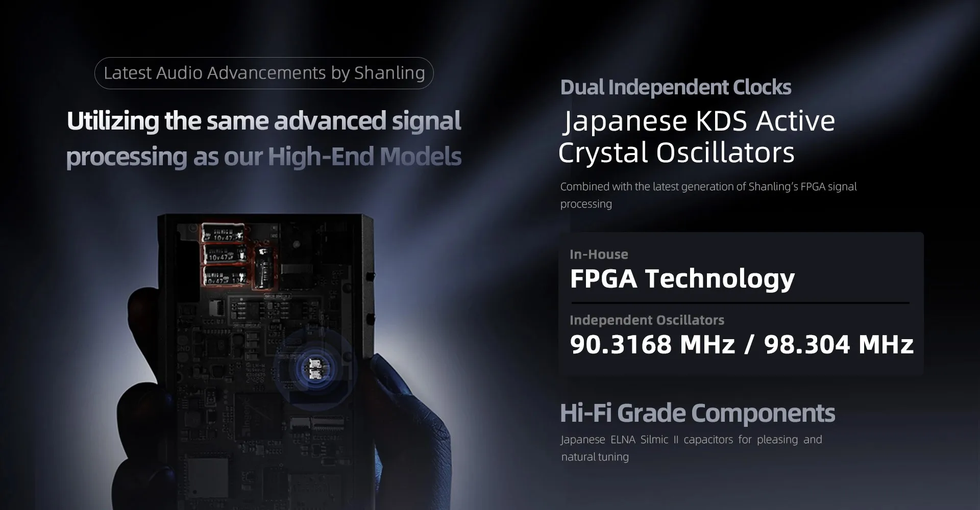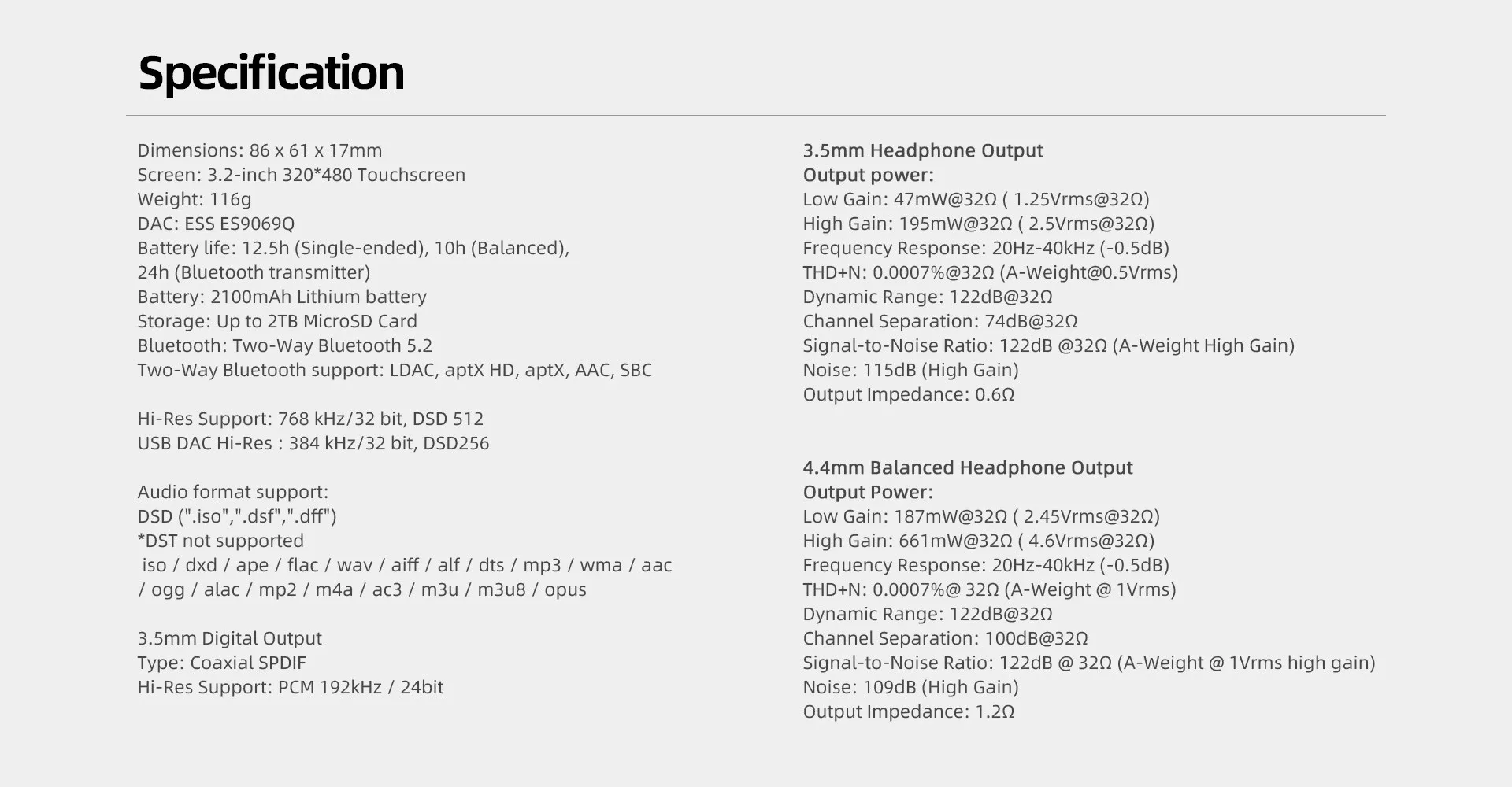 역동적이고 상세한 사운드를 위해 ESS ES9069Q DAC 기반의 오디오 회로, 최대 660 mW @ 32 Ohm의 출력 전력을 제공하는 한 쌍의 SGM8262 앰프와 함께 풀 사이즈 오디오 애호가 헤드폰에도 적절한 전력을 공급합니다. 4.4mm 균형 및 표준 3.5mm 시장에 나와있는 모든 이어폰 및 헤드폰과 쉽게 일치시킬 수 있습니다.
