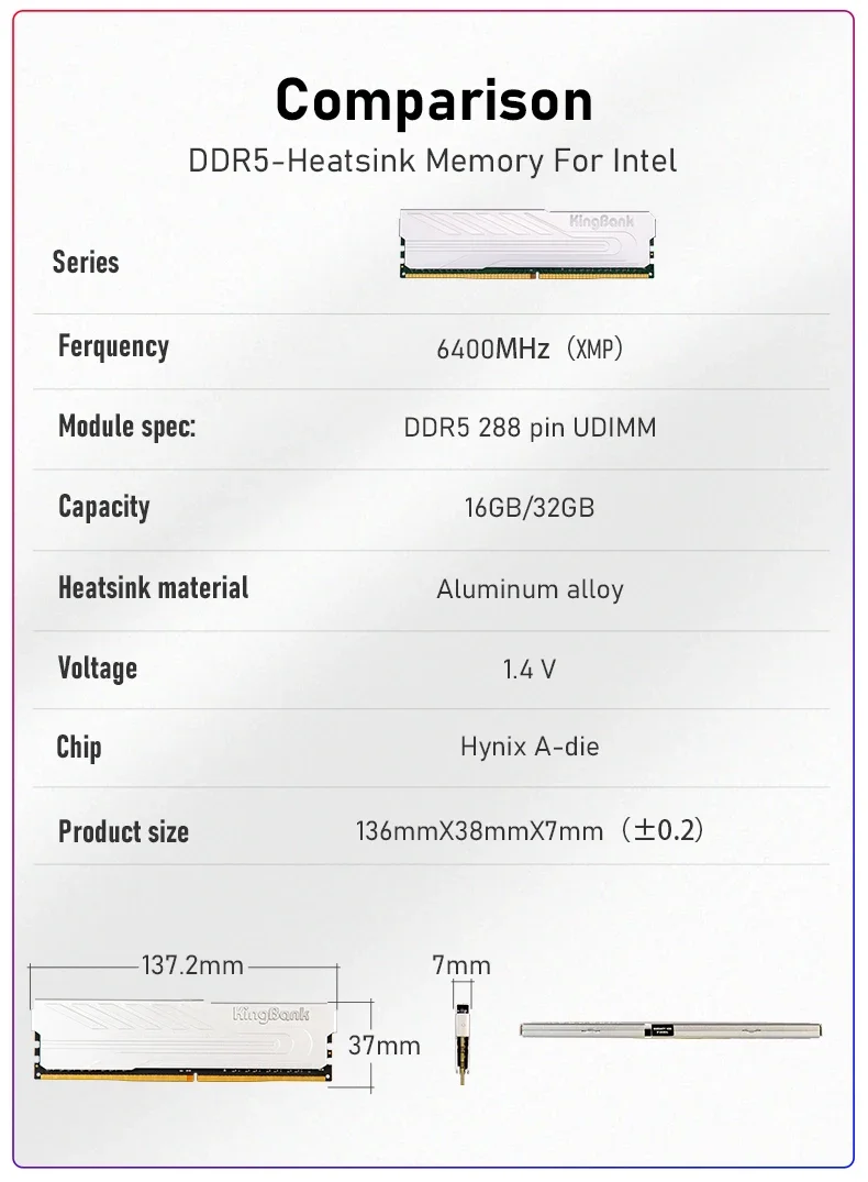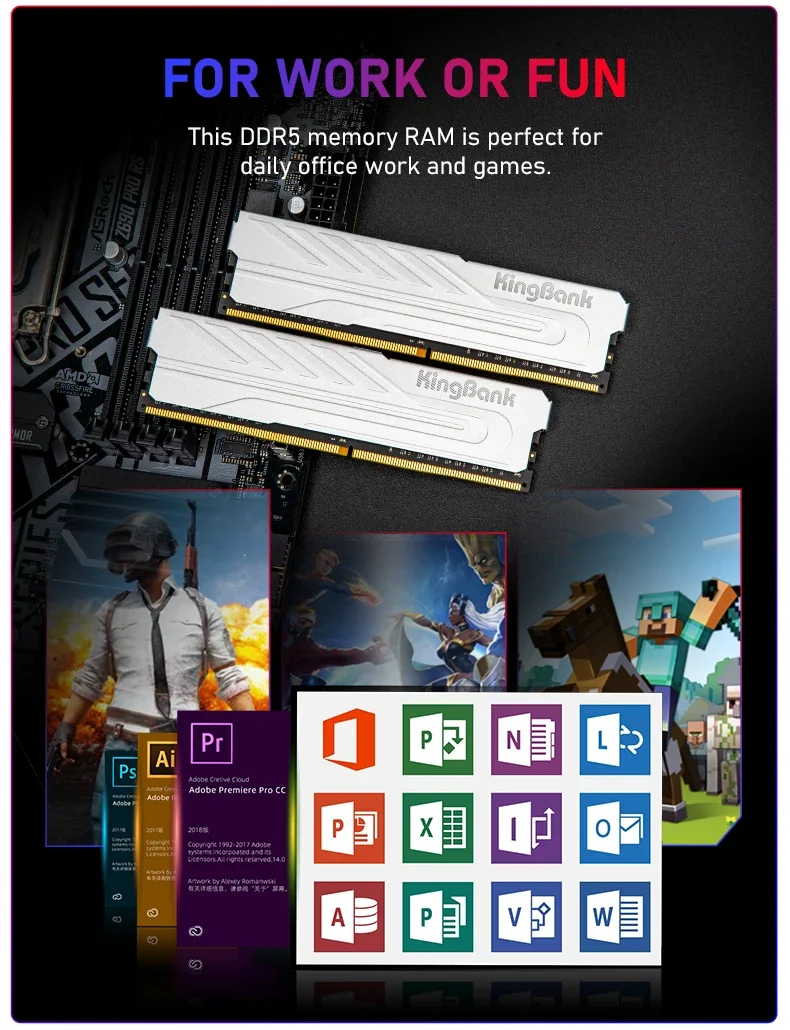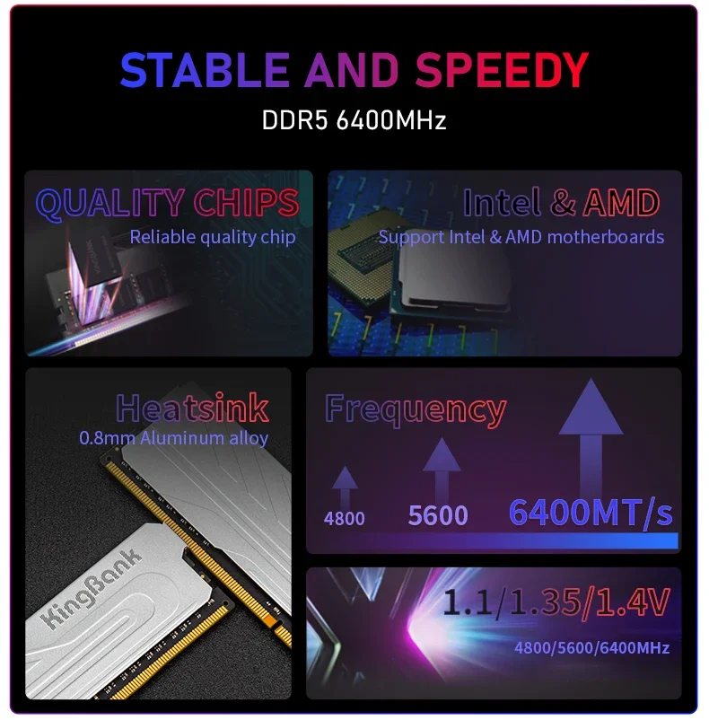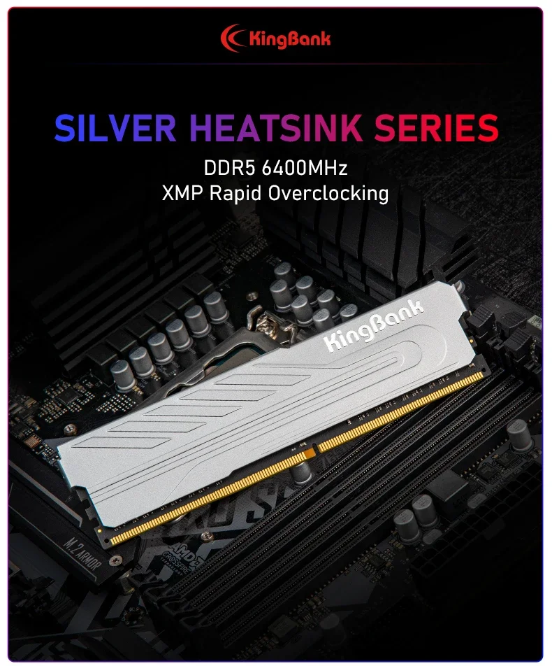 KingBank 실버 방열판 DDR5 게임 메모리는 6400 MT/s까지 실행할 수 있습니다. 각 288 핀 DIMM에는 PMIC (전원 관리 IC) 및 ECC (오류 수정 코드) 가 장착되어 보다 안정적인 성능과 고속 작동이 특징입니다. 매트 실버 알루미늄 합금 방열판으로 무장한 메모리 모듈은 더 나은 방열 기능을 제공합니다. 원래 생산 된 IC 및 기타 부품을 사용하여 호환성, 신뢰성 및 전반적인 성능에 대한 엄격한 테스트를 거쳤습니다.
