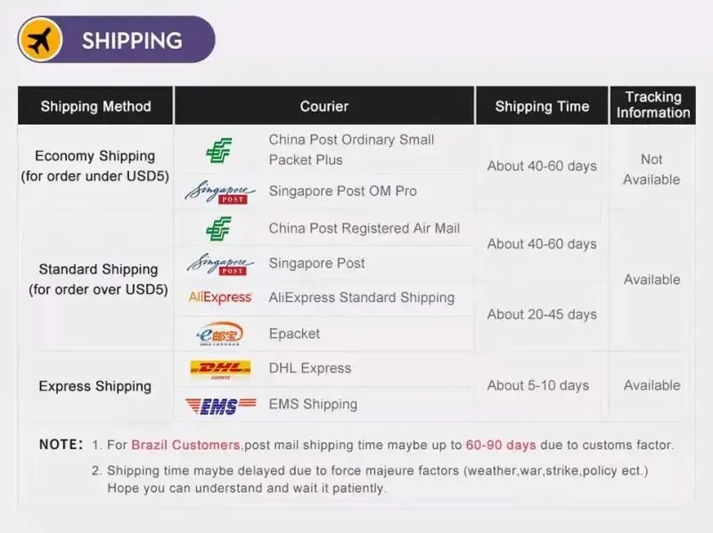 Q: 항목을 추적하는 방법? A: 이 링크로 추적할 수 있습니다: www.17track.net Q: 도매 가격은 어떻게 받을 수 있습니까? A: 도매가 필요하면 저희에게 연락하십시오. Q: Dropship Dropshipping 수락 했습니까? A: Dropshipping에 동의하면 송장, QR 코드, 프로모션을 발송물에 넣지 않습니다. 그러니 걱정하지 마세요. 그냥 사세요. 최선을 다하겠습니다. 어떤 종류의 제품이든 저희에게 연락하십시오.